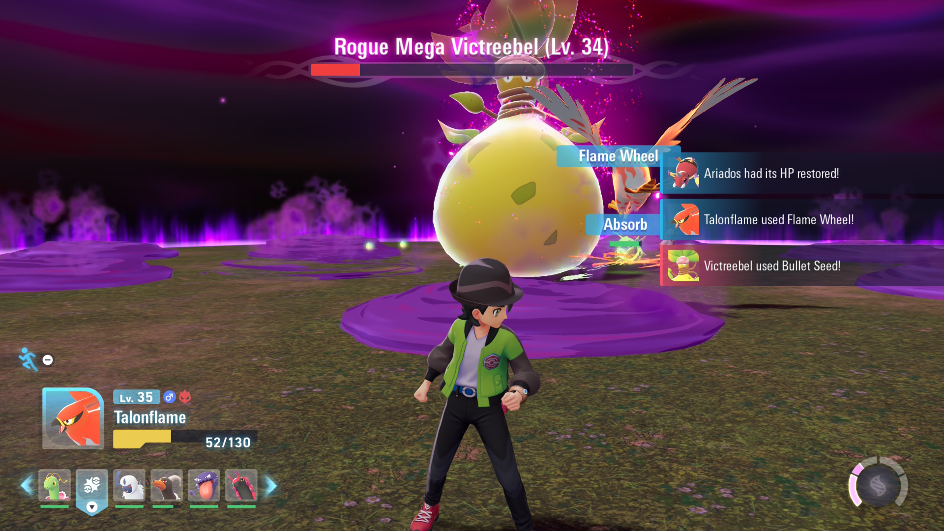 Rozgrywka została podzielona na dwa główne filary: łapanie pokemonów i walkę. W teorii to bardzo dobry pomysł – jedna część bardziej spokojna, eksploracyjna, druga dynamiczna i nastawiona na akcję.W praktyce problemem jest sposób, w jaki te elementy są ze sobą połączone. Zamiast płynnego przechodzenia między systemami, gra wyraźnie je rozdziela. W jednej chwili skupiasz się wyłącznie na łapaniu, skradaniu się i eksploracji, a chwilę później trafiasz do segmentów, w których liczy się głównie walka. W skrócie mamy tutaj po pierwsze system dnia i nocy – za dnia (i w nocy) można wchodzić do specjalnych wydzielonych stref w których mieszkają dzikie Pokemony (i ich spaczone, wściekłe wersje) – możemy je tam łapać, tłuc dla EXP i tak dalej. Nocą (i tylko nocą) pojawiają się czerwone strefy walki, które musimy grindować za punkty, koniec końców dające nam bilet do kolejnego „gym leadera”. Samych Pokemonów, bo wróćmy do nich na moment – jest w grze około 230. To dość mały wycinek jak na 1000 istniejących, ale większość z nich jest w porządku – mamy tutaj solidne podstawy z 1 i 2 generacji, a także trochę nowych, chociaż nie zawsze udanych. Mój zespół to oczywiście klasyki jak Charizard czy Gengar, ale miewałem też przy pasku mniej znane zwierzaki. To co jest idiotyczne i bezsensowne to fakt, że podstawowa trójka pod starter to powtórki z innych gier. W dodatku uważam, że dość głupio dobrane, to trójka widoczna poniżej. Znane i lubiane? Ale nie dość, że powtórki, to jeszcze dwa z nich są z tej samej generacji. Po co?