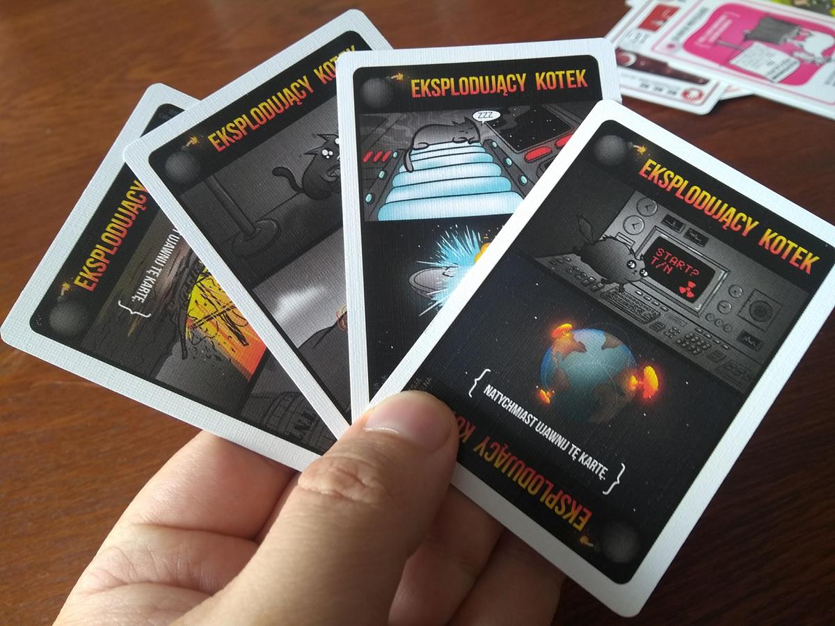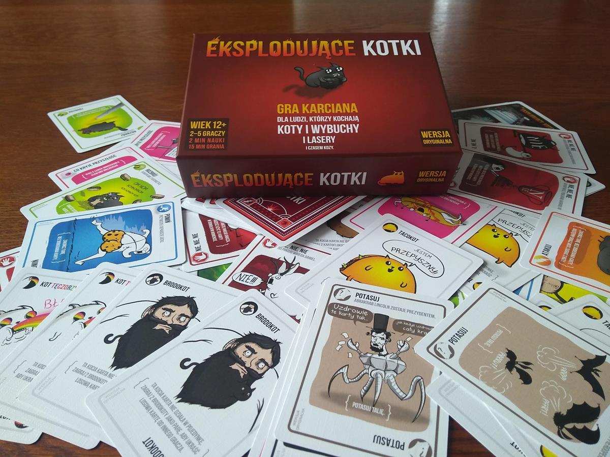 Eksplodujące kotki to prosta, ale szalenie wciągająca karcianka skupiająca się przede wszystkim na próbie przetrwania. Każdy z graczy otrzymuje na start 8 kart – siedem zwykłych oraz jedną pozwalającą „rozbroić” zagrożenie. Następnie do stosu kart dokładamy resztę kart rozbrojenia oraz o jednego wybuchającego kotka mniej niż wynosi liczba graczy. Talię dokładnie tasujemy i kładziemy na środku stołu. Od tego momentu rozpoczyna się zajadła, pełna wybuchów, laserów, rodzinnych dramatów i uroczych kotków – wojna. Każdy z graczy w swojej kolejce może zagrać ze swojej ręki dowolną ilość kart skierowaną przeciwko dowolnemu graczowi. Te są różne: oddanie losowej karty, blokada czyjegoś ruchu, wymieszanie talii czy spojrzenie w przyszłość (sprawdzenie 3 kolejnych kart ze stosu). To oczywiście nie wszystko, ale grzechem byłoby zdradzenia tego co kryje w sobie ten cudownie zaprojektowany system. Pod koniec swojej tury każdy z graczy musi dobrać kartę z podstawowej, leżącej na stole talii (chyba, że zagrał kartę, która pozwala mu pominąć ten ruch). I w tym właśnie cała zabawa – aby tego nie zrobić. Gdzieś w talii ukryte są przecież „Eksplodujące kotki” które jeśli nie posiadamy karty rozbrajającej eliminują nas z gry. Rozgrywka jeśli chodzi o emocje i towarzyszące nam napięcie przypomina czasami partię pokera o wysoką stawkę. Ponieważ kotków jest mniej niż graczy to na polu walki może pozostać tylko jeden – albo ten najszczęśliwszy, albo najbardziej przebiegły i wredny.