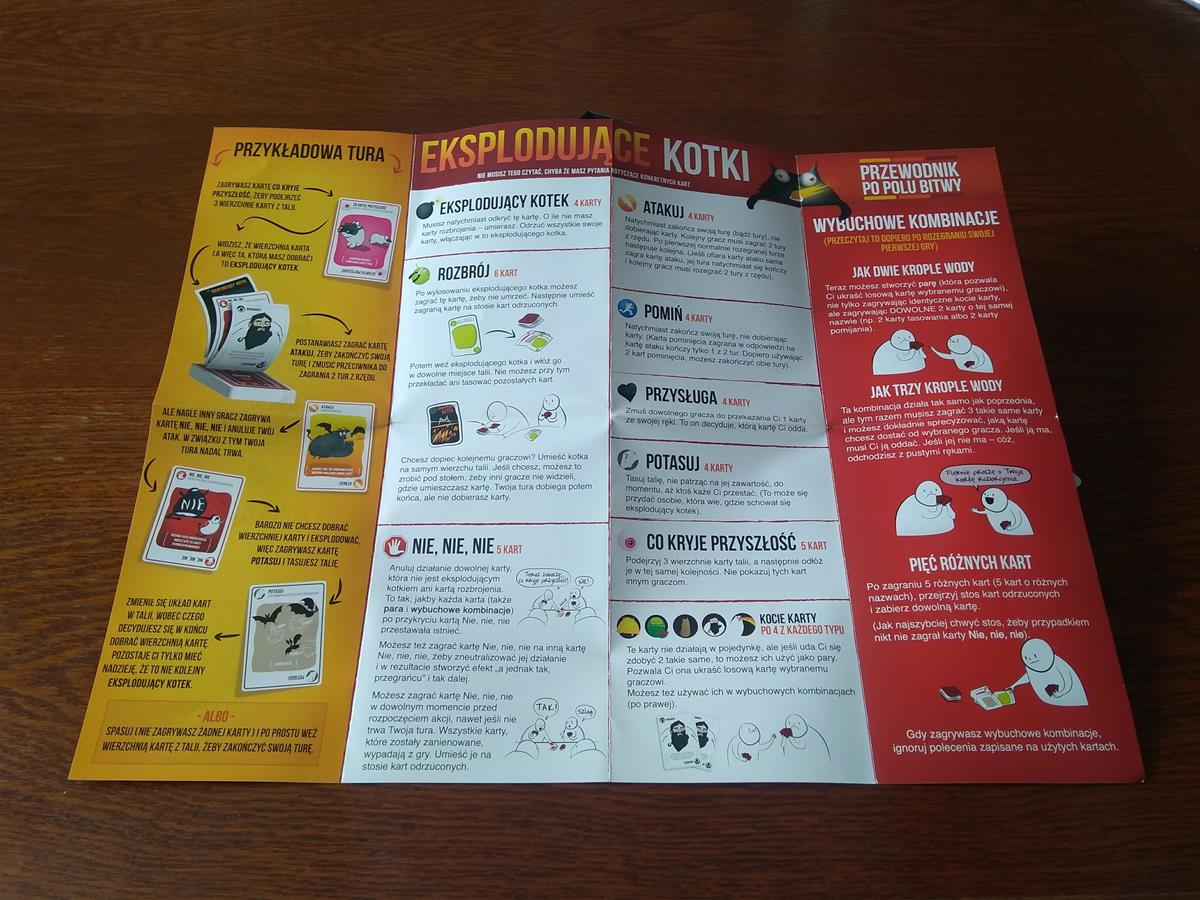 Pudełko w którym dostajemy „Eksplodujące kotki” jest małe, poręczne i wykonane z dobrej jakości kartonu. Sprawdziłem osobiście i na upartego zmieści się nawet w tylnej kieszeni dżinsów. Oprócz 56 kart w pudełku znajdziemy również instrukcję. I tutaj kolejne miłe zaskoczenie – ta jest szczegółowa, zabawna i objaśniająca meandry rozgrywki w sposób tak prosty i przystępny, że nikt nie powinien mieć problemów z ogarnięciem o co tak naprawdę chodzi. W instrukcji znajdziemy też kilka podpowiedzi taktyk oraz co najważniejsze przejrzyste wytłumaczenie funkcji i możliwych zagrań każdą z kart.