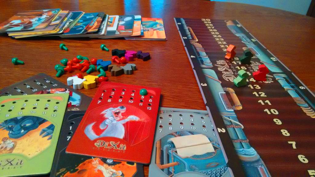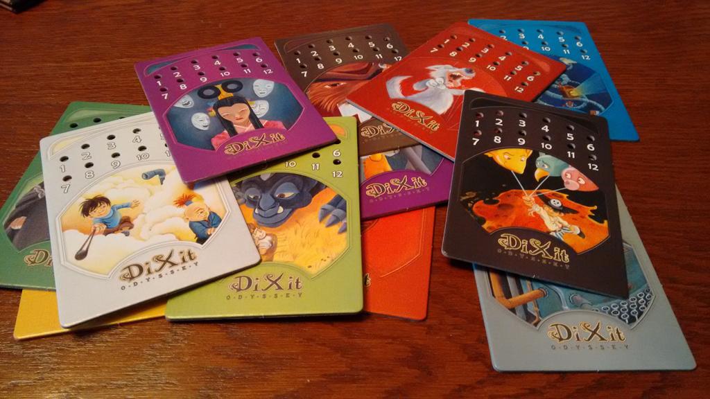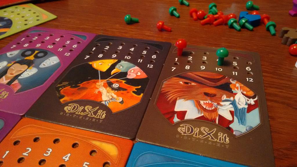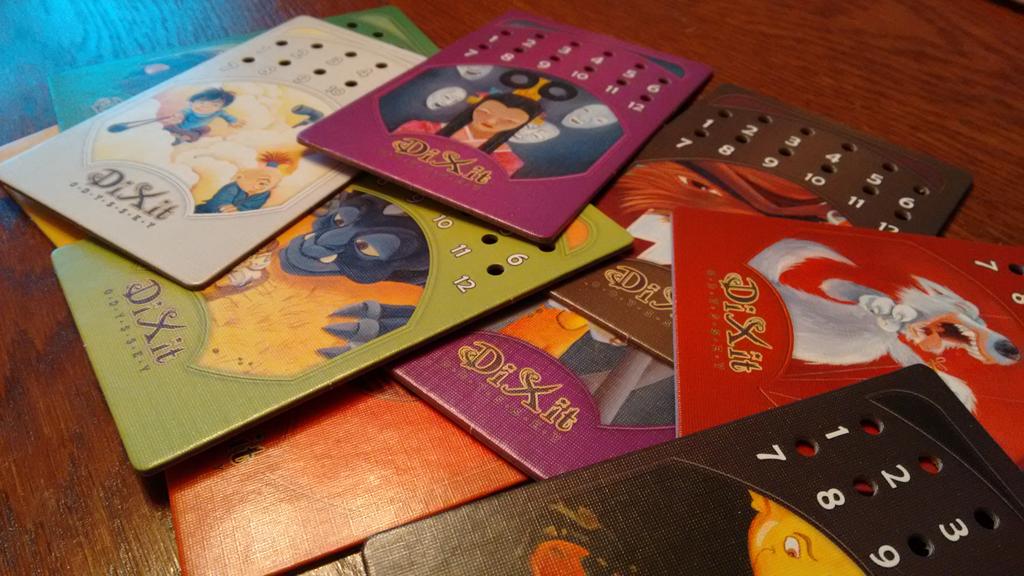 W zwykłym Dixit, głosowanie na karty odbywało się poprzez zostawianie żetonów przy swoim wyborze. Gdy na stole rozkładaliśmy wszystkie karty, kładliśmy lub dawaliśmy temu, kto wymyślił skojarzenie – żetony z numerkami. Tym razem jest inaczej i dostajemy do ręki specjalną kartę pełną dziurek i plastikowe pinezki. To dzięki nim „zaznaczamy” na co głosujemy. Rozwiązanie to sprawdza się świetnie, wszystko mamy w ręku, a sama gra rozrosła się dzięki temu do możliwości grania aż w 12 osób! Tyle właśnie dziurkowanych kart zostało oddanych do naszego użytku. Minimalną liczbą osób jest natomiast trójka, nie ma sensu grać w mniej, bo nie ma sensu zgadywać, kto dał jaką kartę, skoro albo ja, albo ta druga osoba.