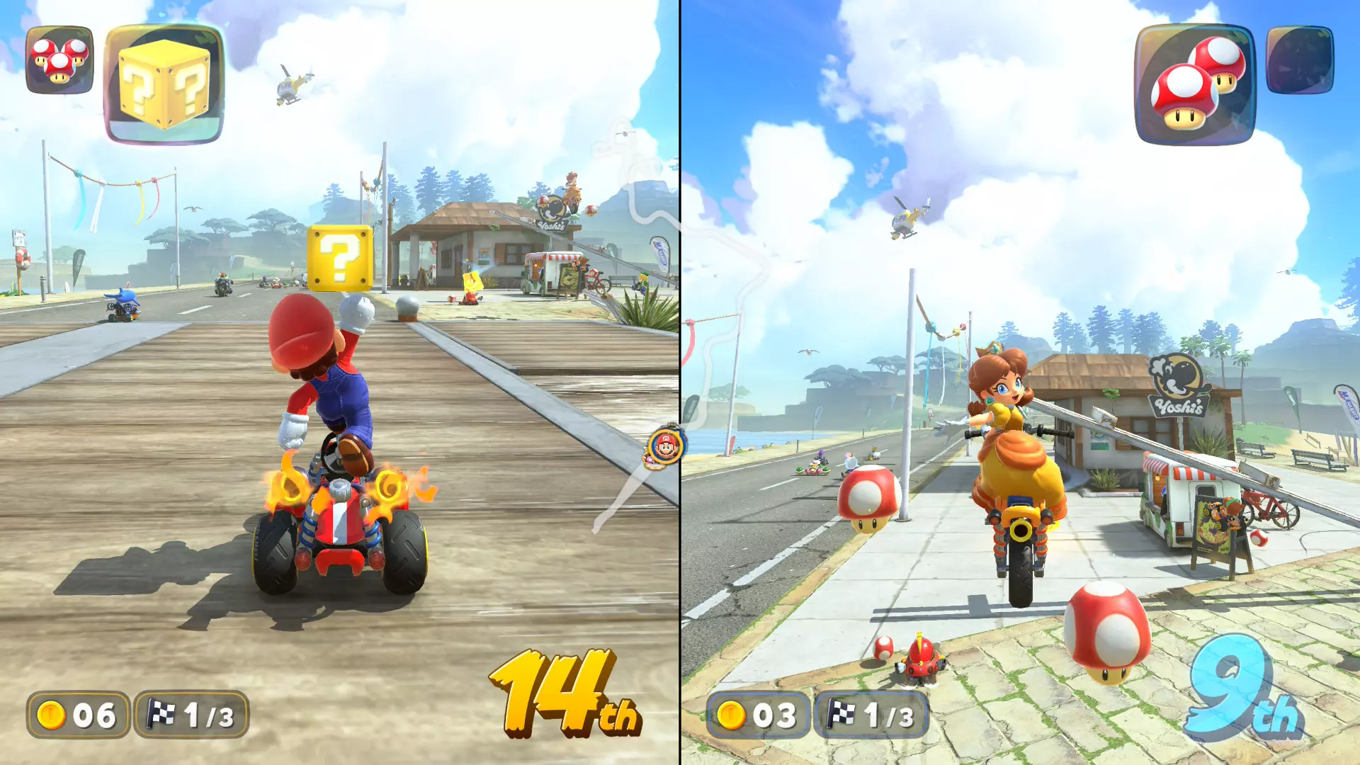 Najbardziej jednak boli zmarnowany potencjał. Twórcy zupełnie nie wykorzystali możliwości, jakie dawał otwarty świat – aż prosiło się, by eksploracja i wykonywanie wyzwań nagradzane były czymś sensownym, np. nowymi postaciami, pojazdami czy ciekawymi strojami. Niestety, w Mario Kart World wszystko jest sztywno podzielone: postacie zdobywamy wyłącznie przez wygrywanie Pucharów, pojazdy za zebrane monety, a stroje tylko poprzez zbieranie jedzenia podczas wyścigów. Swobodna jazda po świecie nie daje właściwie nic wartościowego – to ogromna, niewykorzystana szansa.
