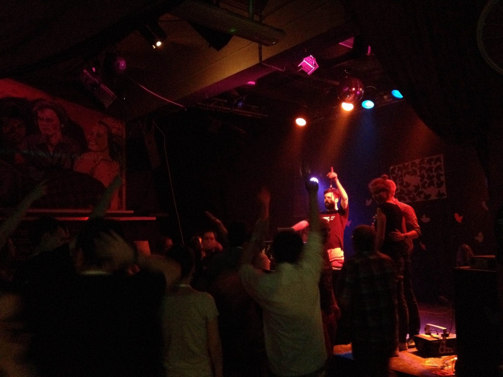 Częścią główną było oczywiście spotkanie w miejscu Chwila. Czekały na nas śliczne i bardzo porządnie zrobione identyfikatory, które dzięki wyraźnemu zdjęciu pozwalało namierzyć „kto jest kim”. Pogadanek, dyskusji i przytulania nie było końca. Bo tak własnie jest z ludźmi z Twittera – ciągle się przytulają, ponieważ powstają tam naprawdę silne więzi, mimo, że tak naprawdę możemy zamienić z kimś tylko 140 znaków, minus długość jego nicka. W pewnym momencie na scenę wkroczył różowy ninja, czyli DJ Tito, który do prawie 4 rano nie odchodził zza konsolety porywając do tańca prawie 200 osób. Chociaż tutaj tego nie widać, to ludzie tańczyli bez wytchnienia wiele godzin.