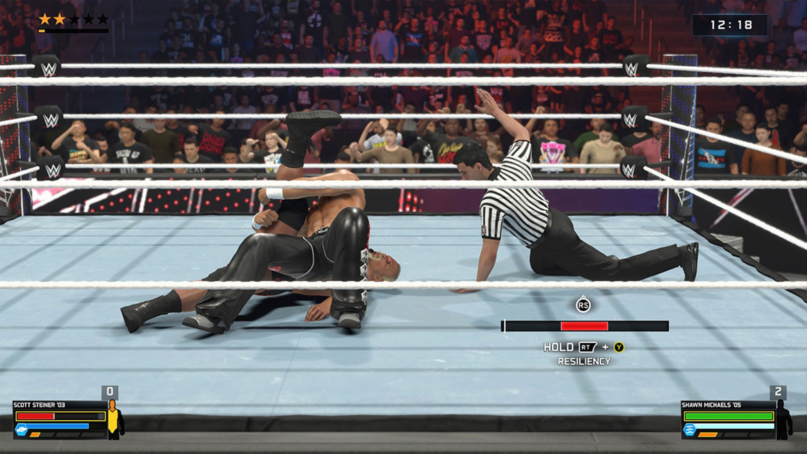 Przechodzimy do mięsa, czyli mechaniki. Nadal mamy klasyczny układ – ciosy lekkie, ciężkie, chwyty, reversale – tylko że wszystko to jest teraz oblepione coraz grubszą warstwą pasków, wskaźników, mini gierek i świecących pierdół. I żeby było jasne – kiedy walka płynie, potrafi być naprawdę satysfakcjonująca. Czuć ciężar ciała, czuć impakt przy rzutach, kombinacje wchodzą płynnie, a wymiana finisherów potrafi wywołać autentyczne napięcie. Problem zaczyna się w momencie, kiedy system mówi: koniec zabawy. Mówię konkretnie o staminie, która w tej odsłonie jest po prostu koszmarem. Zamiast dodawać jakiejkolwiek głębi, działa jak kaganiec na tempo walki. Rozkręcasz się, łapiesz flow, robisz kilka efektownych akcji i nagle twoja postać zamienia się w zdychającego żółwia. Każdy ruch wygląda, jakby ktoś przywiązał jej do nóg dwa worki cementu. Zamiast emocji z odwracania losów pojedynku masz frustrujące dreptanie po ringu i czekanie, aż pasek łaskawie się podniesie. W grze, która udaje dynamiczny sport rozrywkowy, to po prostu zabija klimat – dość powiedzieć, że wyskakują mi już filmiki na YouTube jak staminę wyłączyć.